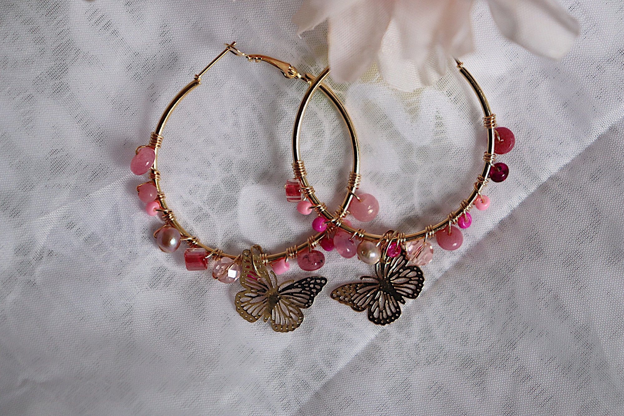 pink variety beads wired on gold hoops, with cut out butterfly charm